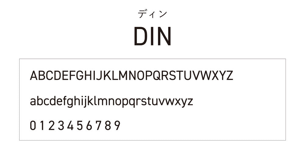 直線的で均一な線が特徴の視認性が高い機能的な書体です。 1930年代にドイツの工業製品の型番表記などに使うために生まれました。(日本の「JIS」に相当する、ドイツの工業規格「DIN」が名前の由来です)