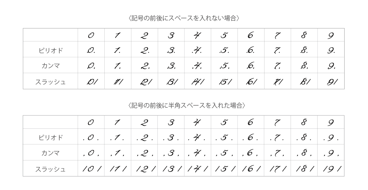※Reginaの場合、「.」「,」等の記号は前後の文字や数字により、半角スペースを入れないとつながってしまう場合がございますので、予めご了承ください。