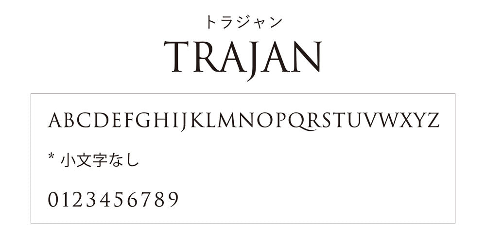 欧文書体の定番であり、古くから愛されてきた品格のある書体です。2000年前のローマ皇帝トラヤヌスの墓所(の記念碑)に刻まれた文字を元に作られ、映画のポスターやブランドロゴのベースとしても使用されています。